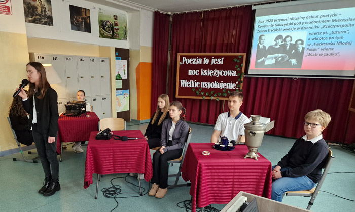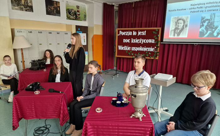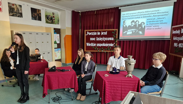 "Poezja to jest noc księżycowa,/ Wielkie uspokojenie..." 28 marca 2025r. odbył się w naszej szkole poranek poetycki poświęcony życiu i twórczości Konstantego Ildefonsa Gałczyńskiego w związku ze 120. rocznicą urodzin poety. W montażu słowno- muzycznym, przygotowanym przez nauczycieli języka polskiego, informatyki oraz nauczyciela współorganizującego lekcje, udział wzięli uczniowie klas V, VI, VII i VIII. Spotkanie poetyckie przybliżyło widzom sylwetkę autora "Zaczarowanej dorożki" i skłoniło wszystkich do refleksji.