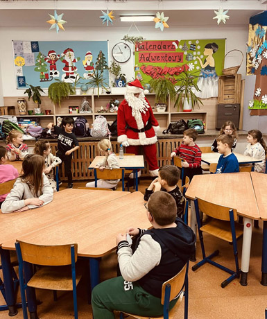 Dzisiaj naszą świetlicę odwiedził wyjątkowy gość — sam Święty Mikołaj! Dzieci przywitały go z ogromną radością, a potem zasypały trudnymi, zabawnymi i bardzo pomysłowymi pytaniami, z którymi nawet Mikołaj potrzebował chwili do namysłu. Wspólnie bawiliśmy się w quizy i konkursy z nagrodami, a atmosfera była pełna śmiechu i świątecznego ciepła. Mikołaj uważnie wysłuchał każdego dziecka, zrobił sobie ze wszystkimi pamiątkowe zdjęcie i oczywiście nie zapomniał o słodkich niespodziankach. To był piękny, radosny czas — pełen uśmiechów, emocji i magii zbliżających się świąt. Dziękujemy Mikołajowi za odwiedziny i już nie możemy doczekać się kolejnego roku!