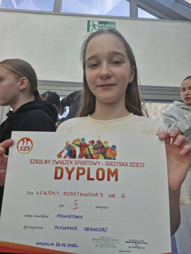 Drużynowe zawody pływackieW dniu 26.02.26 odbyły się organizowane przez Szkolny Związek Sportowy Drużynowe Zawody Pływackie. W rywalizacji Igrzysk Dzieci drużyna dziewcząt uzyskała wysoki wynik 103 pkt - czas sztafety 6x25 -1:51.26 plasując się na II miejscu. Gratulacje!!!