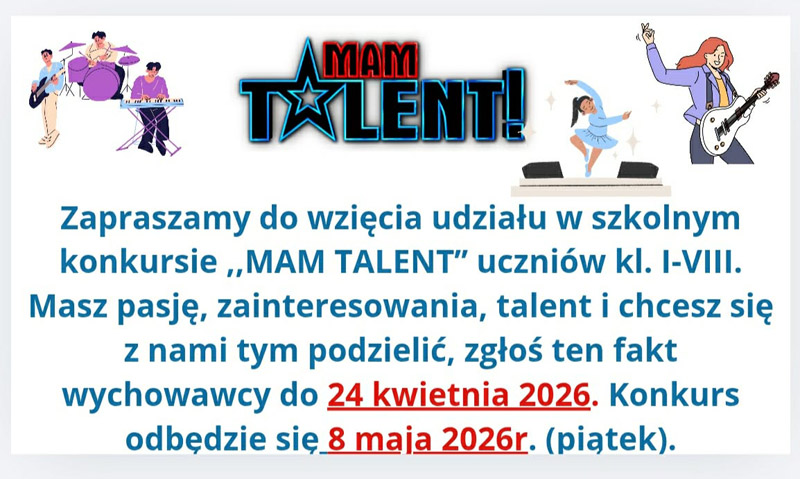 Z przyjemnością ogłaszamy II edycję szkolnego konkursu „Mam Talent”! Zapraszamy uczniów klas 1–8 do udziału i zaprezentowania swoich umiejętności. Szczegóły znajdują się na plakacie i w regulaminie. Nie zwlekaj – pokaż swój talent! Organizatorzy: Nauczyciele we współpracy z Samorządem Uczniowskim.