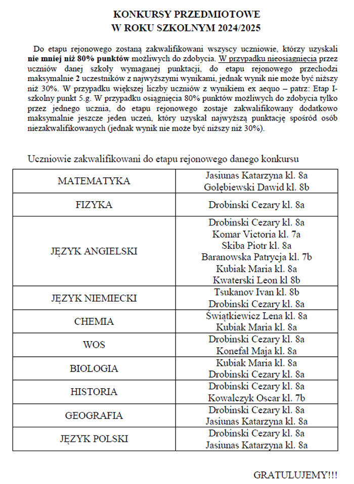 Laureaci etapu szkolnego konkursów kuratoryjnych
