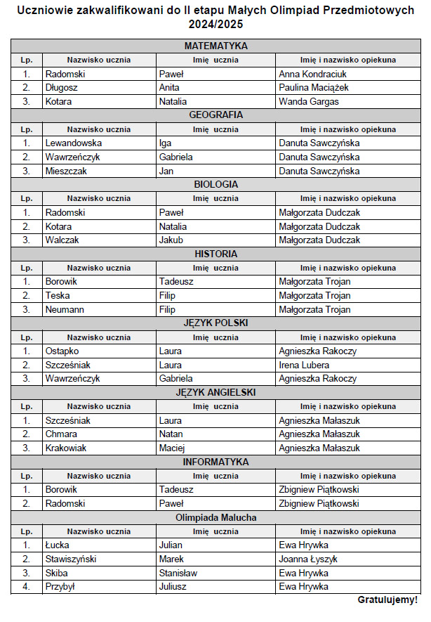 Uczniowie zakwalifikowani do II etapu Małych Olimpiad PrzedmiotowychArchiwum
