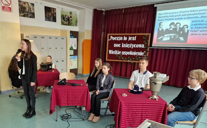 "Poezja to jest noc księżycowa,/ Wielkie uspokojenie..." 28 marca 2025r. odbył się w naszej szkole poranek poetycki poświęcony życiu i twórczości Konstantego Ildefonsa Gałczyńskiego w związku ze 120. rocznicą urodzin poety. W montażu słowno- muzycznym, przygotowanym przez nauczycieli języka polskiego, informatyki oraz nauczyciela współorganizującego lekcje, udział wzięli uczniowie klas V, VI, VII i VIII. Spotkanie poetyckie przybliżyło widzom sylwetkę autora "Zaczarowanej dorożki" i skłoniło wszystkich do refleksji.