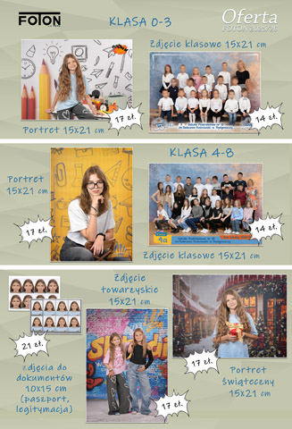 W dniach 26, 27, 28.11.2025 r. uczniowie klas 1-8 będą mogli uczestniczyć w sesji fotograficznej i zrobić zdjęcia indywidualne lub grupowe. Zachęcamy do zapoznania z ofertą.