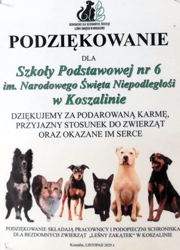 Dary ze szkolnej akcji "Do serca przytul psa weź na kolana kota" zostały przekazane na potrzeby koszalińskiego schroniska bezdomnych zwierząt "Leśny Zakątek". Serdecznie dziękujemy wszystkim darczyńcom naszej wspaniałej społeczności szkolnej za wielkie serce. Organizatorki